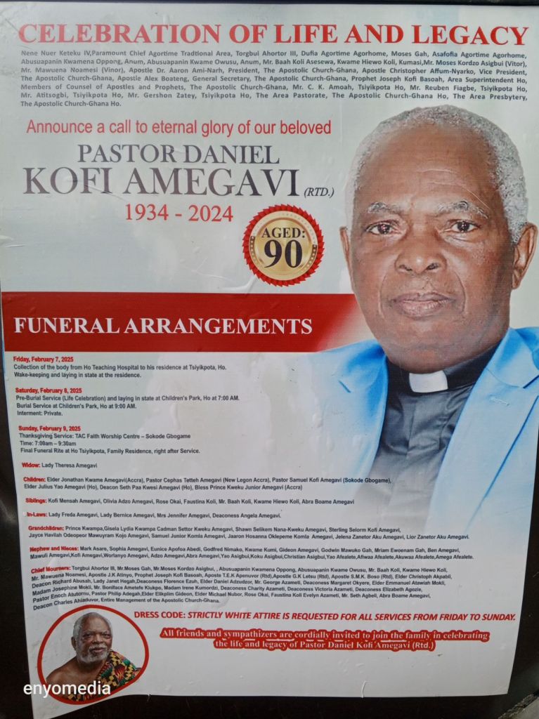 Pastor Daniel Kofi Amegavi(Rtd) passed on to eternity at the ripe age of 90 with his legacy etched in gold into the hearts of those he served with a melody of devotion, sacrifice and divine grace as the tribute by The Apostolic Church-Ghana, Ho Area stated.