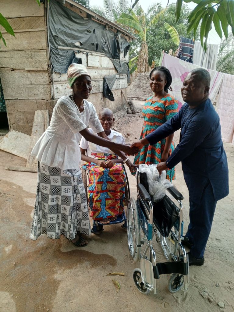 Presenting the donation, Mr Samuel Andy Dormevenu, explained that Mr Martin Fosu answered cheerfully to the request. He prayed for God’s blessings for Mr Martin Fosu. In receiving the gift of a wheelchair, the joyful Madam Rose Ahianyo and her son expressed utmost joy to God and asked for innumerable blessings for the donor.