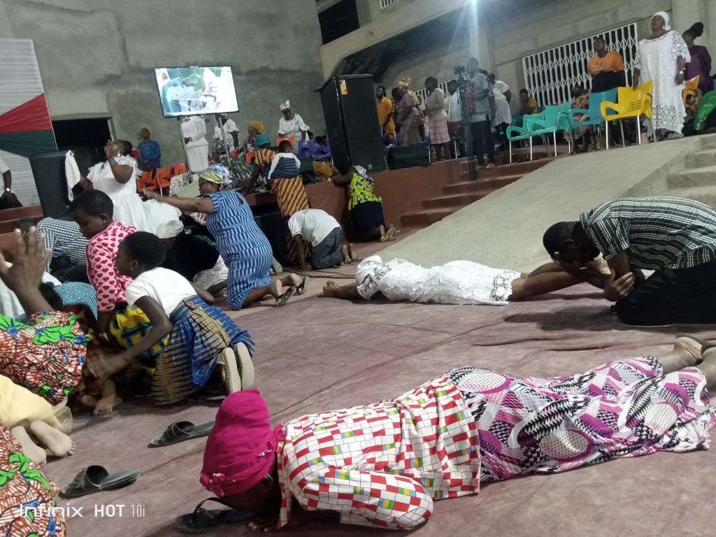 Mrs Doris Peasa led the church in a call to worship Elder Prof Seth Yaw Peasa lies on the floor in worship of his Maker