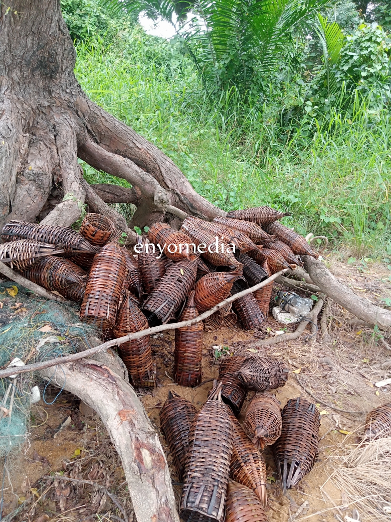 The main occupation of the people in Amedeka is harvesting of fish and ‘osa’ from the river. Osa for lack of a better word is a type of black lobster which is a delicacy. The men do the harvesting of ‘osa’ from rocks in the river with their hands. They are usually kept in special net woven baskets in the river to prevent them from escaping and keeping them alive for later use. The women prepare them for selling in the markets of the bigger towns and along the highways.